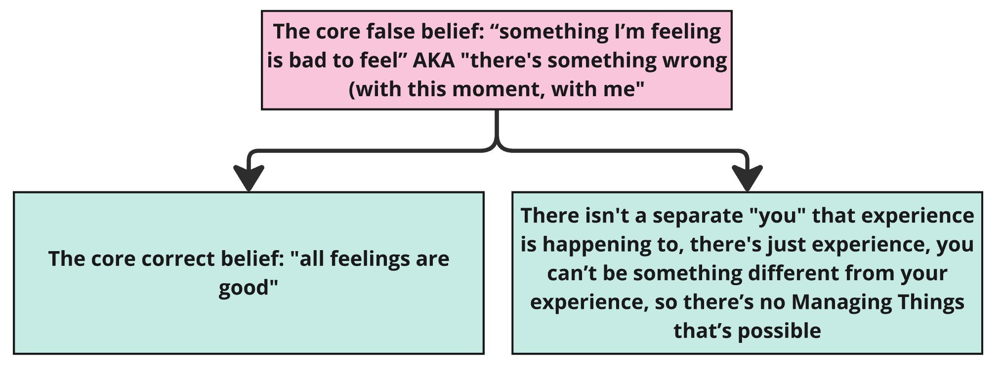 - The ultimate false belief is “something I’m feeling/experiencing is bad to feel/experience”
