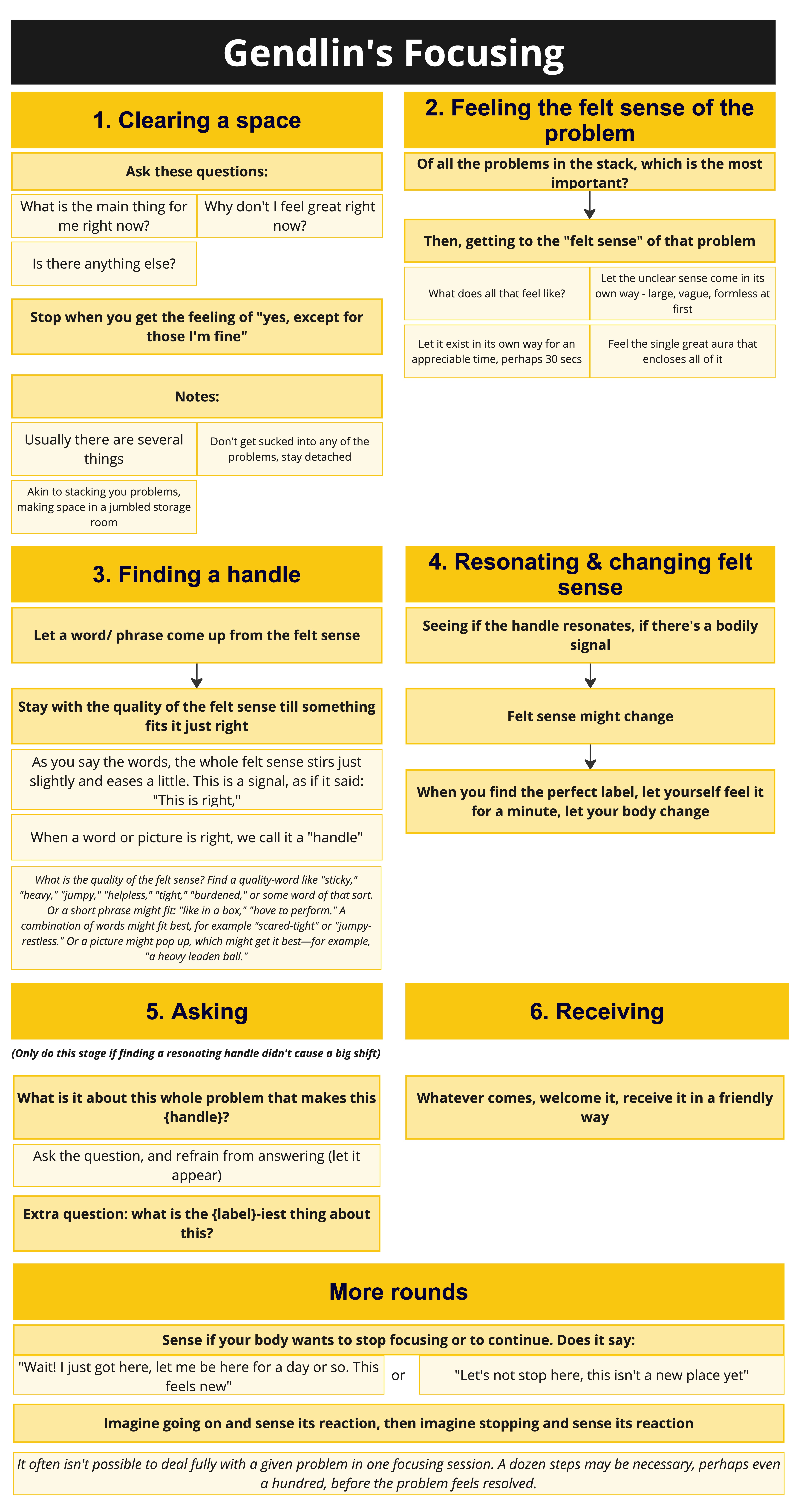 Very simple and a prerequisite to a bunch of other things. Basically the ability to notice feelings in your body, give them labels that fit, and notice a shift/update/insight. Gendlin describes Focusing as the thing that differentiates people who have success in talk therapy vs those that don’t (as some will notice when something feels off in their body, investigate and update, and others just remain in narrative land for the entire session and never update)