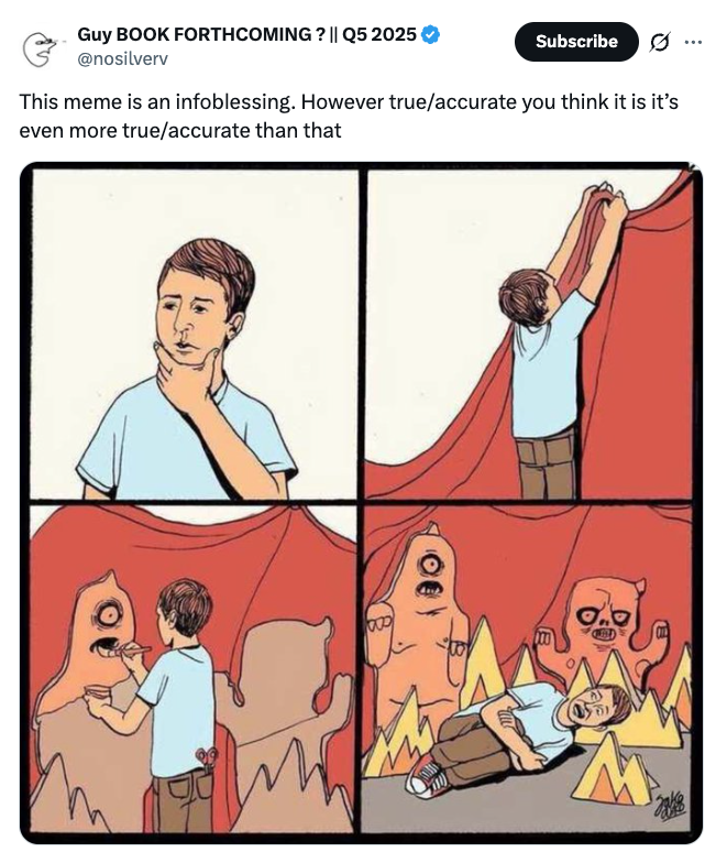 https://x.com/nosilverv Many great tweets on this topic, e.g.: Guy (@nosilverv) - sensations vs imaginations model Experiencing layer 1 has to be non-conceptual https://x.com/nosilverv/status/1770971978729427162 ”Get out the car” - not by concepts https://twitter.com/nosilverv/status/1774578088141062259 new banger!! https://x.com/nosilverv/status/1919001192824217975 Guy & Michael Stroe https://x.com/nosilverv/status/1978397740628316421 https://x.com/nosilverv/status/1982441996506538444 Banger!!! 👇 the tweet