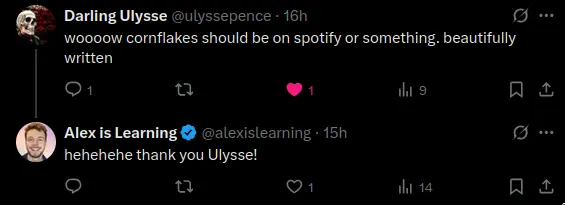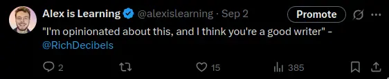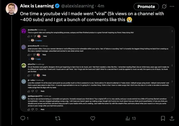 - Iāve gotten really good feedback on my vignettes and substack posts and youtube videos and even some of my shitty songs.