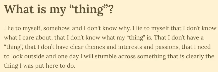 Iāve pretended that I donāt know what my āthingā is, but really, I want to create things, I want to be an artist, I want to share my experience