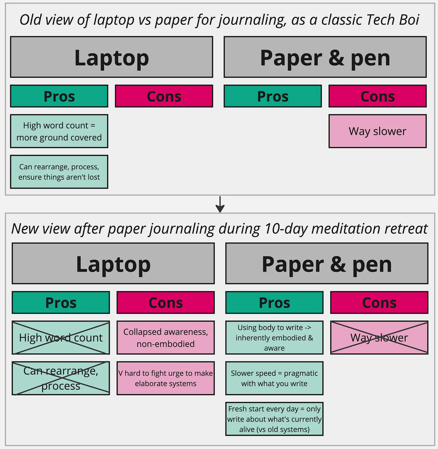 Then I went to a 10 day vipassana (Goenke-style) retreat, and smuggled in a paper journal, and discovered that paper journaling actually has a few huge benefits that were also very in line with stuff I had been thinking about for a while, and what I assumed were cons-with-no-upside are actually very much worth the hand-cramping, and in fact have strong benefits of their own.Â
