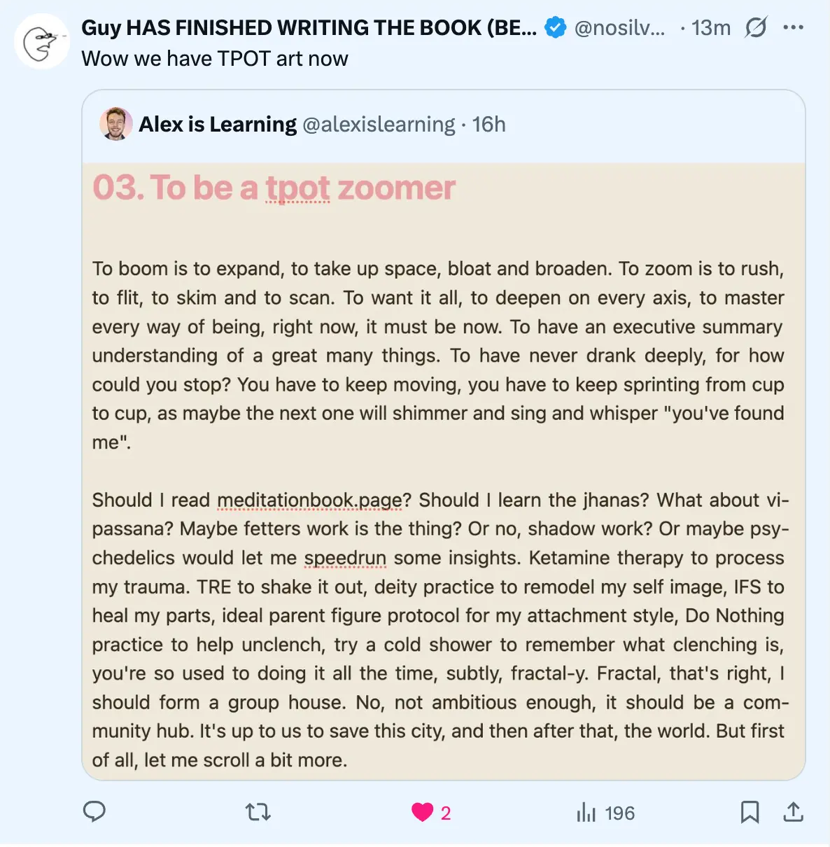 We’re a group of post-rationalist-y, emotional-processing-y people; sometimes we do Circling/Authentic-Relating-y practices, sometimes a “Case Clinic” where one person talks for 20 minutes about a problem in their life and then there are a few rounds of reflections etc.