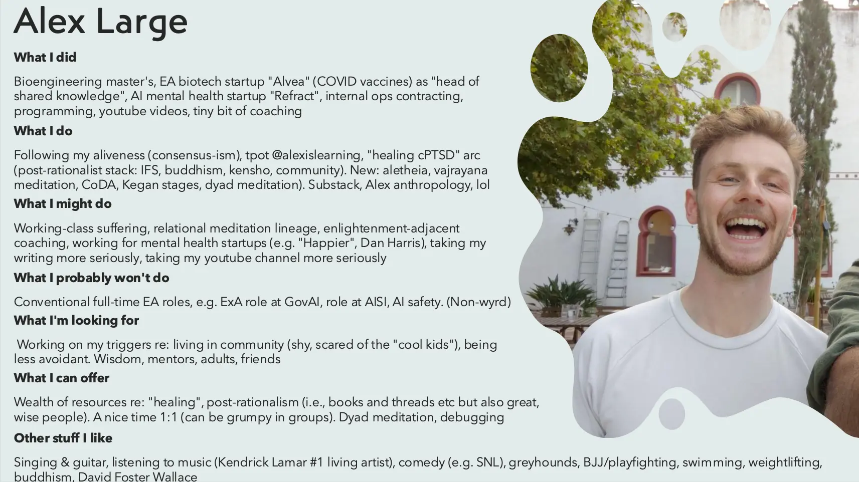 If I lived here for 6+ months, getting to know people more and more over time, working out regularly, working on myself via e.g. Codependents Anonymous and IFS etc, getting mentorship from Attila etc, I think really great things could happen