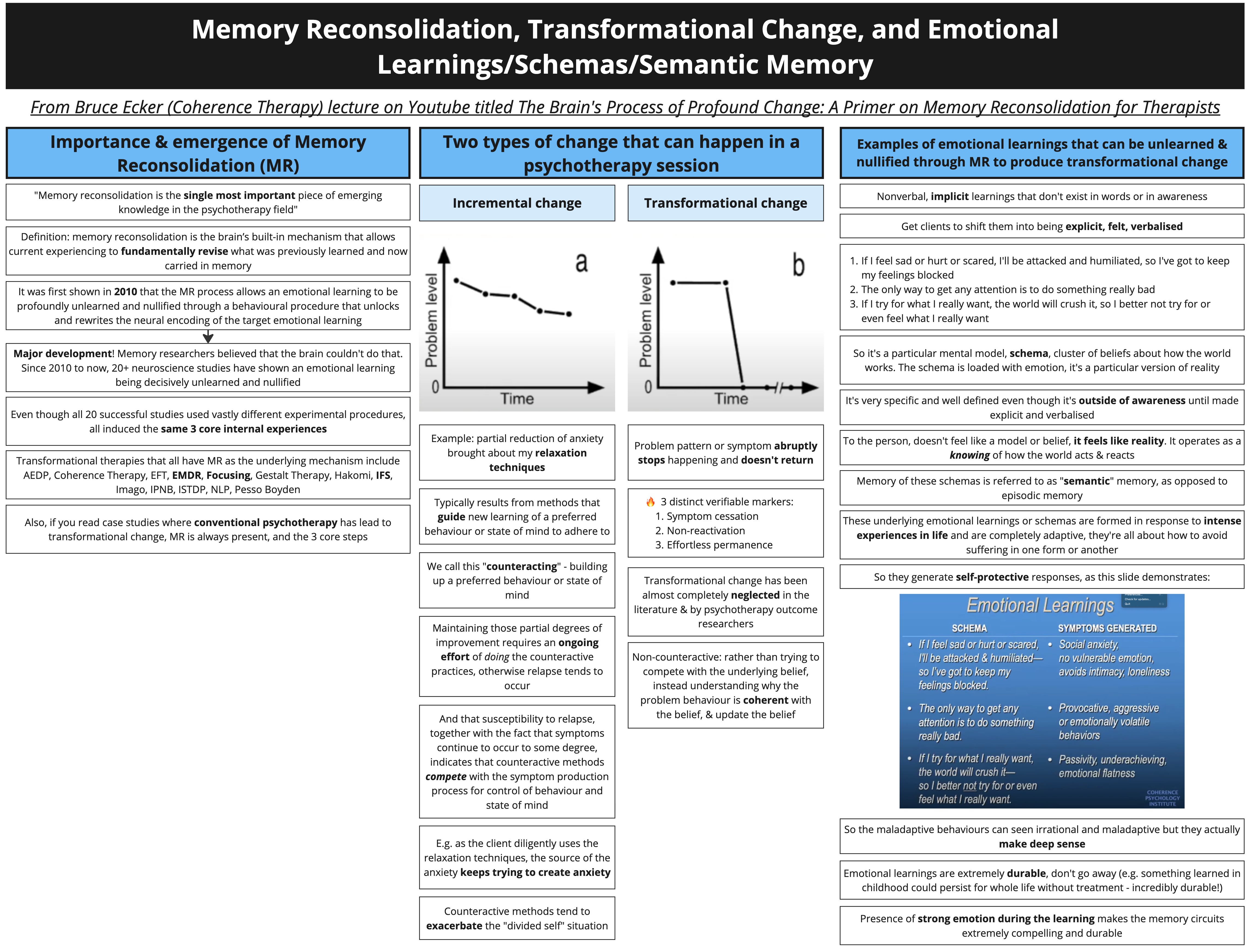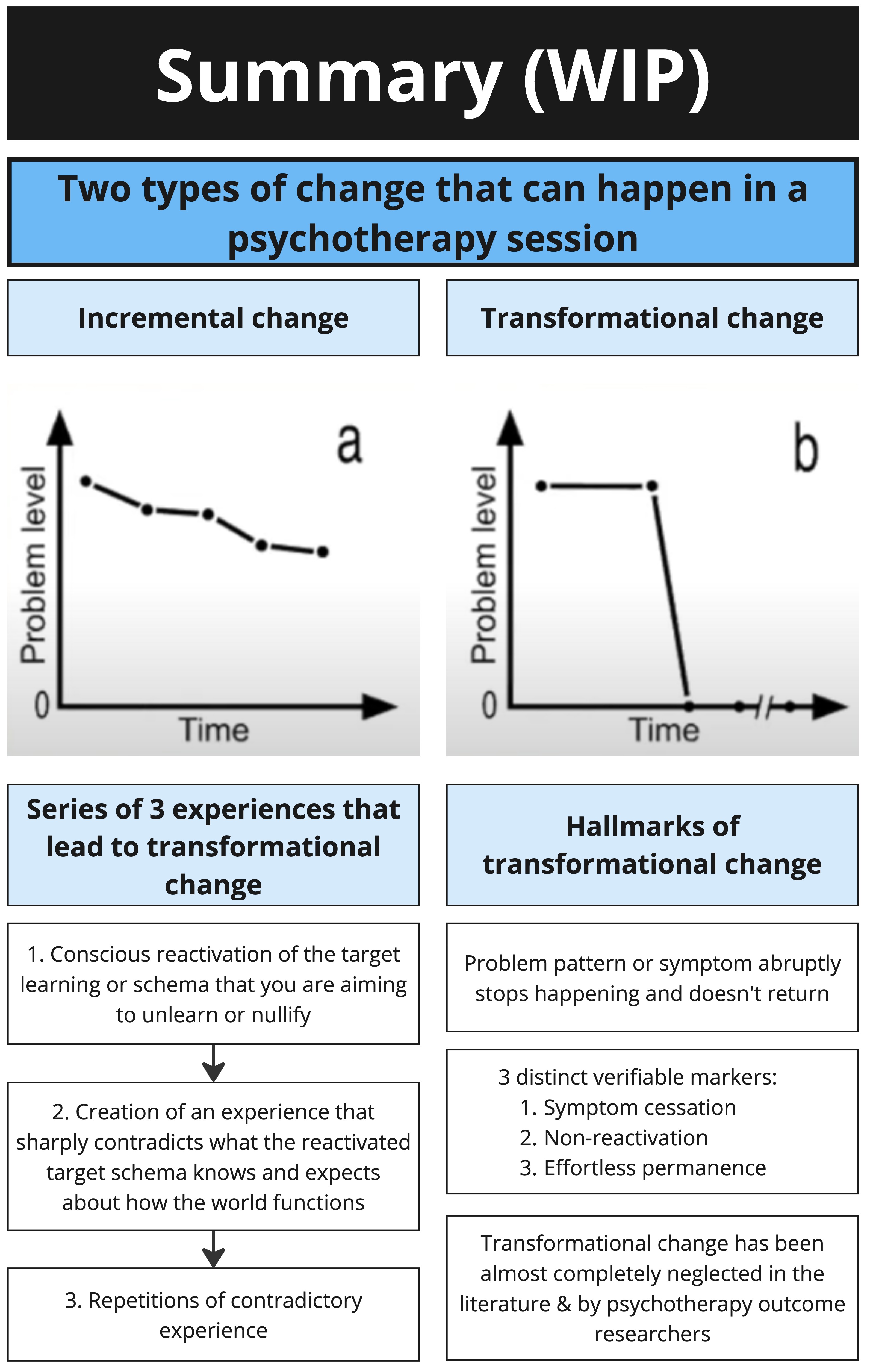 - He talks about how things like CBT lead to incremental change where you leave the limiting belief/habit in place, and try to install a new one to counteract it. Vs with memory reconsolidation, you update the limiting belief, and boom, it’s updated, no need to try to install a new behaviour, you just update. See the time-series graphs in the diagram below