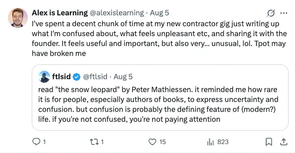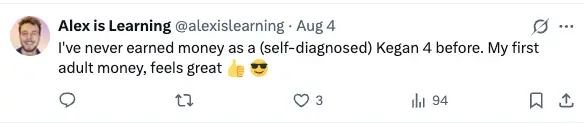- Kegan 3 Alvea/Refract Alex would have been like βwhatever you say goes, sounds good to me!β, whereas now Iβm writing memos on what Iβm confused about, naming blockers and aversion and confusion in meetings etc.