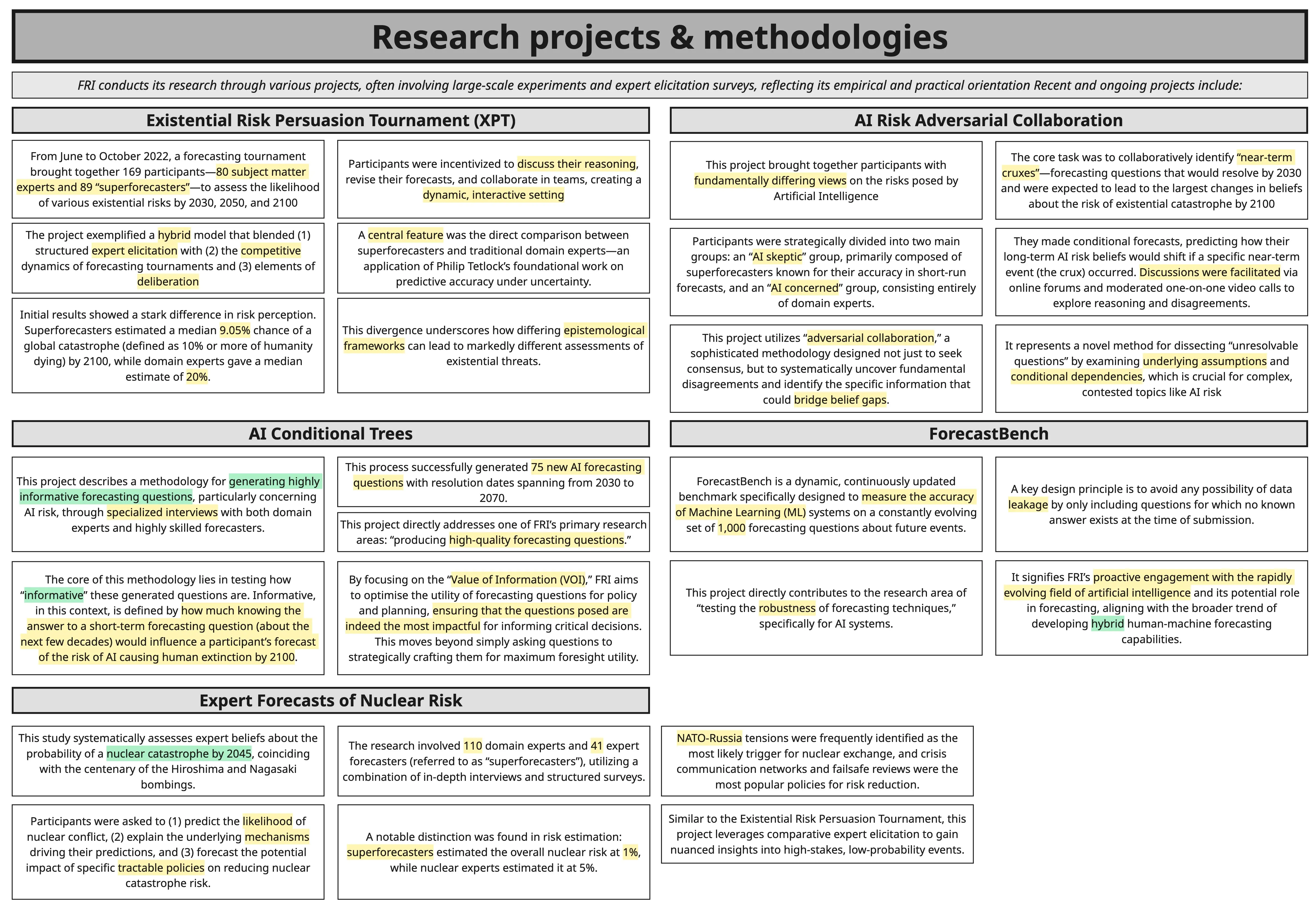 - X-risk â getting superforecasters and domain experts to create the best maps of the territory. Well validated and well reasoned models of e.g. p(doom) from various x-risks â policymakers, governments, charities can be better informed re: priorities, funding, etc. Can discover key cruxes, key conditional probabilities (âif this happens, p(doom) from this x-risk will dramatically increase), very useful for prioritisation and response.