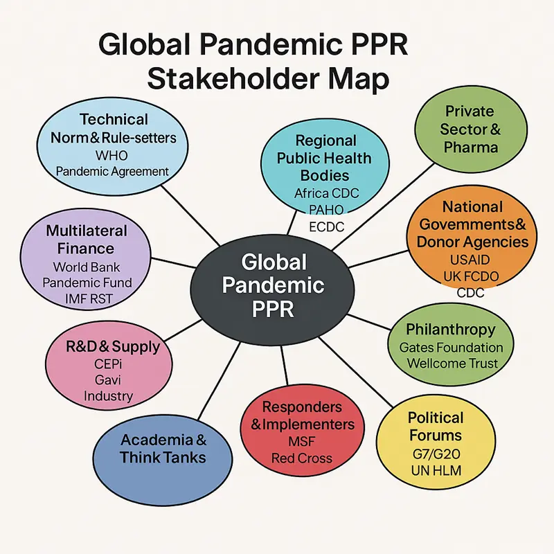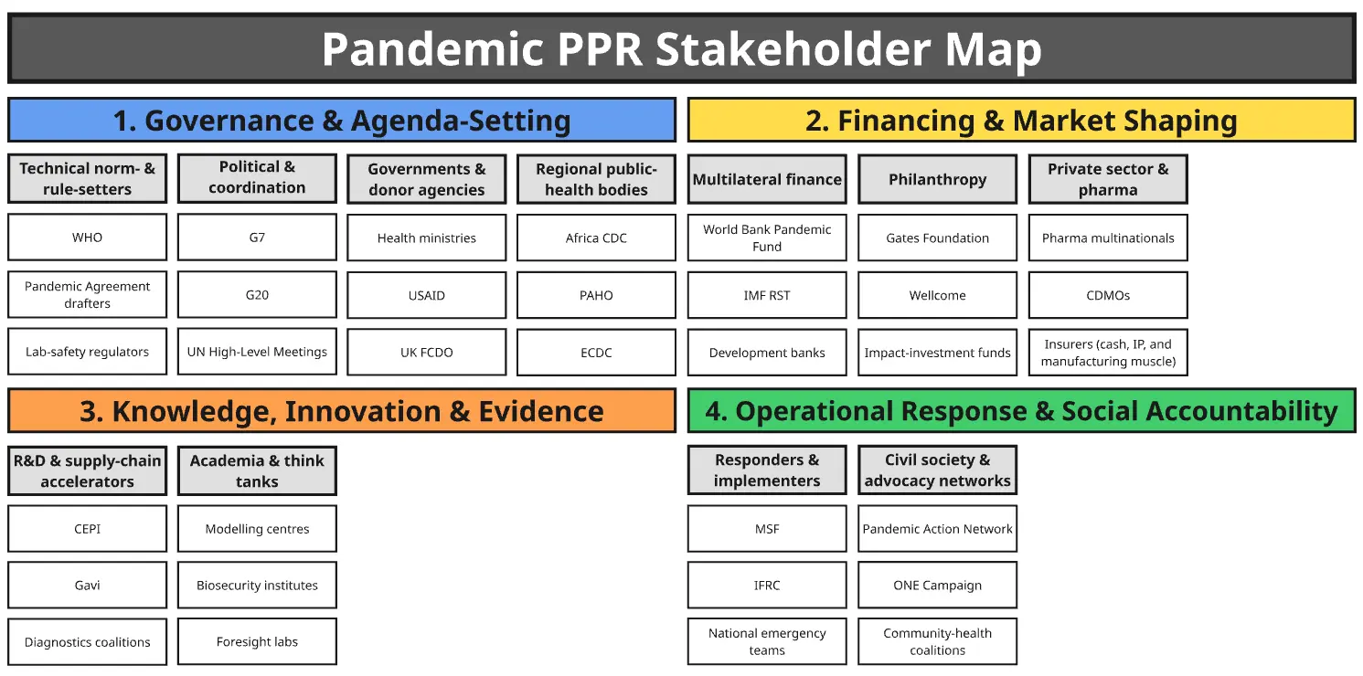 What would a map of this space look like? I'm imagining there are categories of stakeholders, like... financers (world bank), international organisations (WHO), private sector, etc