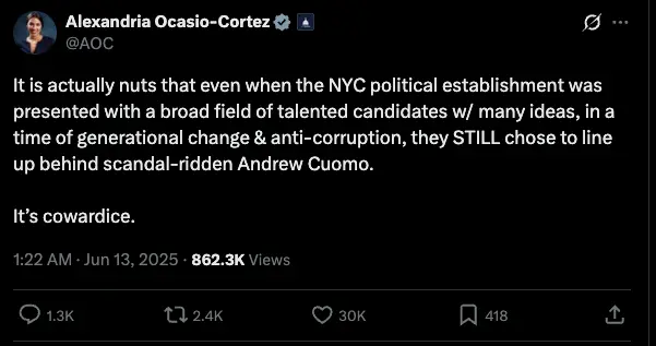 - ❌ FALSE - because he’s running for Mayor (not Governor, as I thought) - he’s running against the current Mayor, who isn’t a relative unknown, because he’s you know, the Mayor of New York City, lol