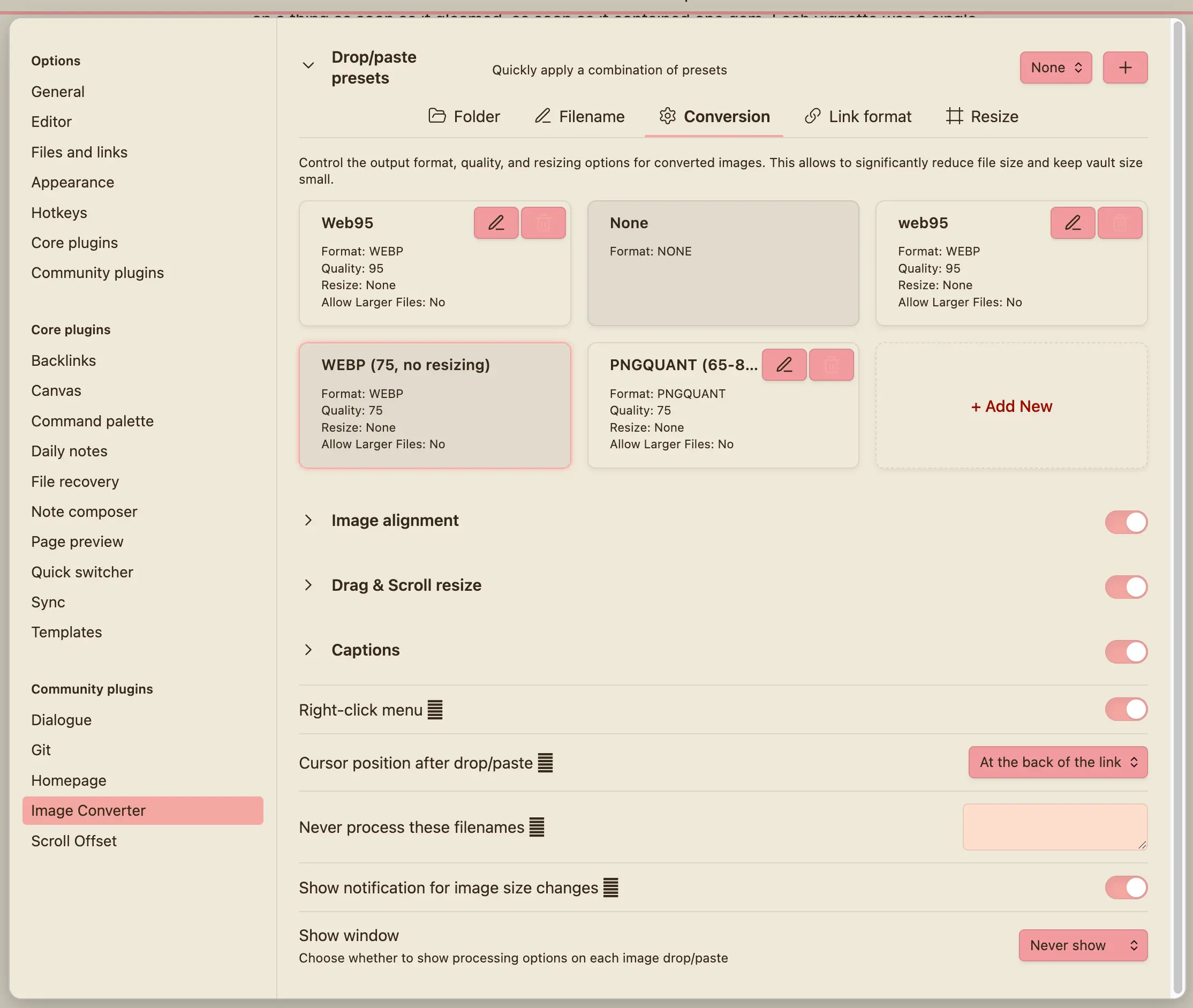 - The plugin “Image Converter” makes this very easy → whenever you copy-paste an image in, it’ll auto-compress it and turn it into a .webp