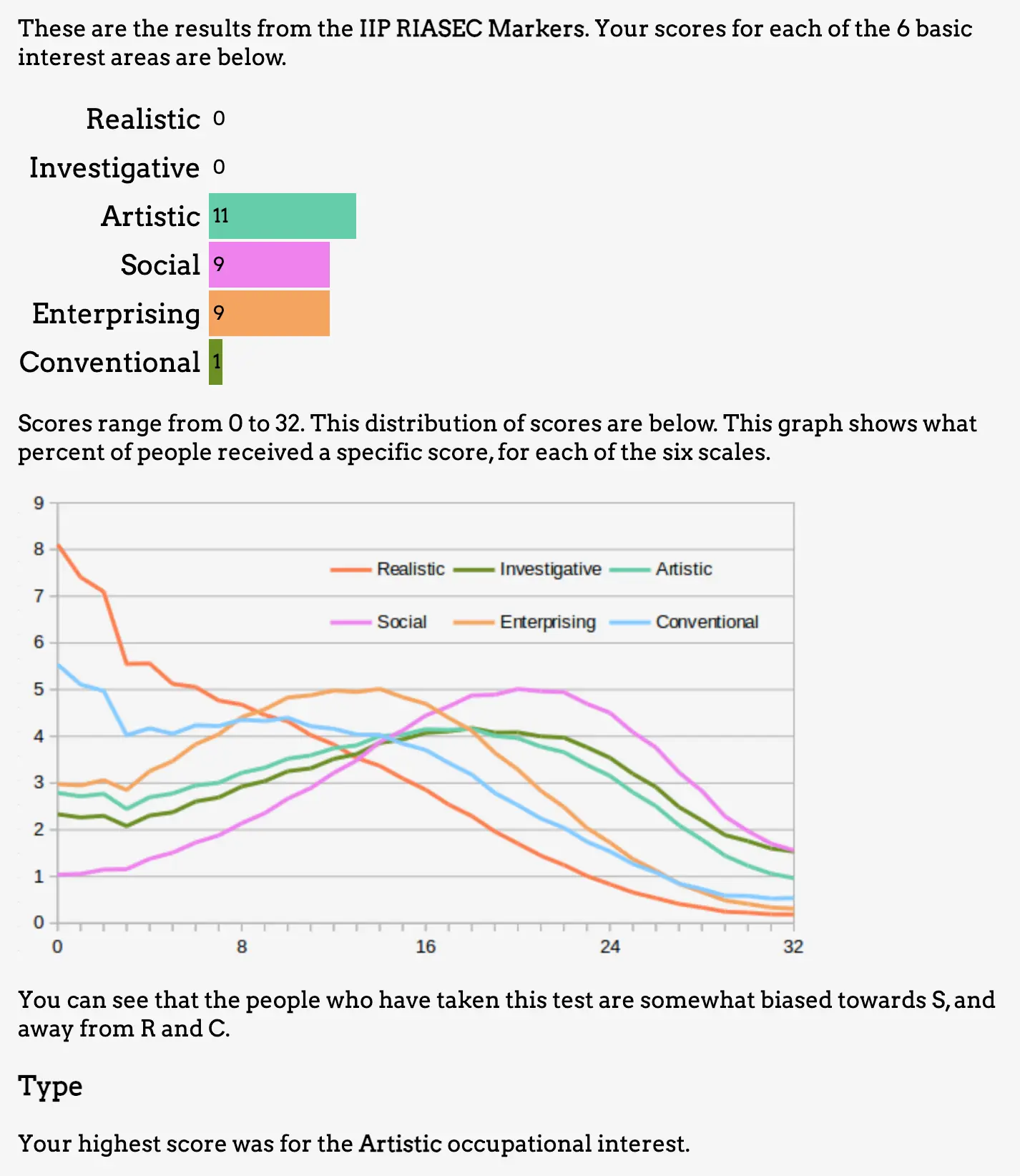 Your Holland results say AES—Artistic (11) + Enterprising (9) + Social (9), very low Conventional (1) and basically no Realistic/Investigative (0/0). That points to creative expression + shaping an audience or venture + people impact, and a strong dislike for rigid structures or hands-on technical/analytical grind.