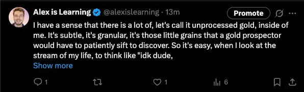 - So, I want to take my nascent insights more seriously. I have a sense that there is a lot of, letās call it unprocessed gold ore inside of me. Itās subtle, itās granular, itās those little grains that a gold prospector would have to patiently sift to discover. So itās easy when I look at the stream of my experience to me like āidk dude, nothing there but a bunch of mudā. But be patient, slow down, sift through the dregs for a while, and youāll find a grain of gold, and then some more, and perhaps your eyes adjust and you can spot them more quickly, and perhaps after a while you have enough to smelt some small thing, a little ring or pendant, not profound, not a weighty ingot, but still, something meaningful to you, perhaps to a loved one or two as well.