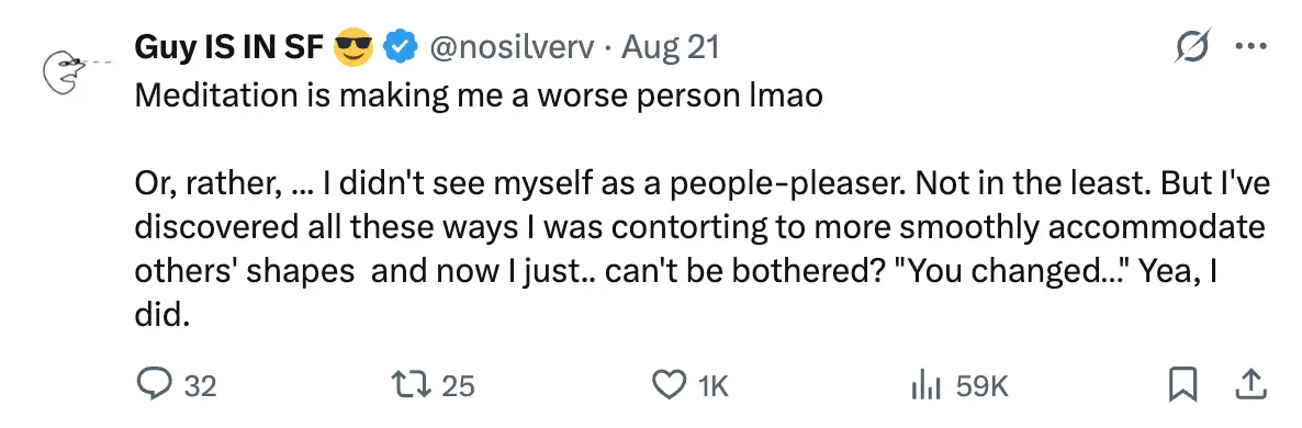 I have a bit of a sense that some point soon it’d be good to install a new story/belief re: the value of chatting, yapping, etc. I feel like I don’t have a sense of playfulness and silliness and default to a kind of intense gloomy presence (astrology girlies will say it’s my scorpio rising). E.g. Nihilism slash dissociation at the hippy retreat 2025-10-10. But at the same time maybe I don’t need to change anything about this. I’m friendly and engaged in 1:1 contexts, I am valued and liked despite this, etc