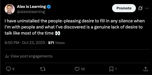 Maybe there’s something here for me like I want to communicate in a vibes-based way, I want to do activities with people, I want it to be safe to be silent when I want to be silent. I want to learn your life story, I want to learn more about what you care about, I don’t want to talk about things that smell like unimportant bullshit