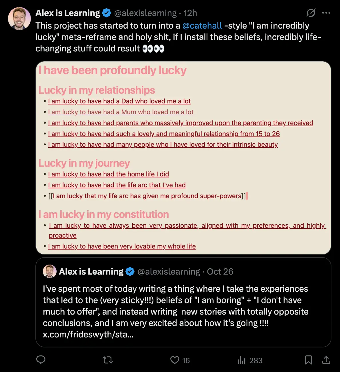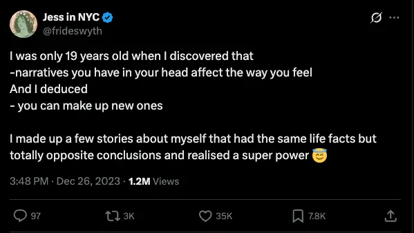 - "I made up a few stories about myself that had the same life facts but totally opposite conclusions and realised a super power"
