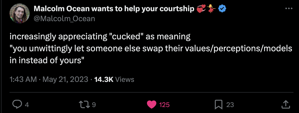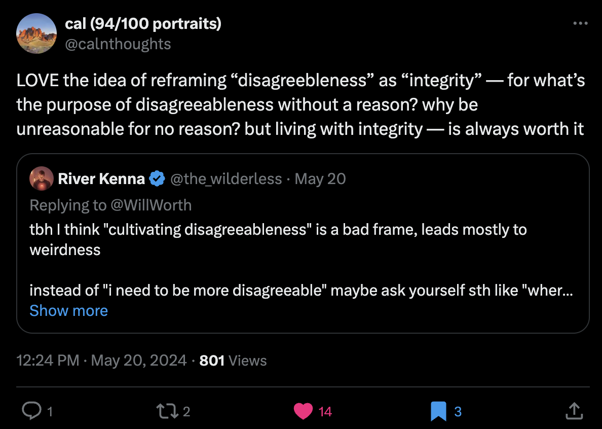 • When you release this conflict, it’s not that you move on to having different, but equivalent, conflicts. It’s that these knots of self-conflict simply disappear. That energy stops being expended. The self at the center of your perception, which was so muddy and thick and tangled, becomes clearer, more prismatic. The idea that you are composed of some sort of special, unique pollution, separate from everything else, becomes laughable. In place of that delusion, something else can be realized. When it appears, you see why people did such a bad job of describing it to you previously, although they may have been trying hard. In the words of Wittgenstein: “There are, indeed, things that cannot be put into words. They make themselves manifest. They are what is mystical.”