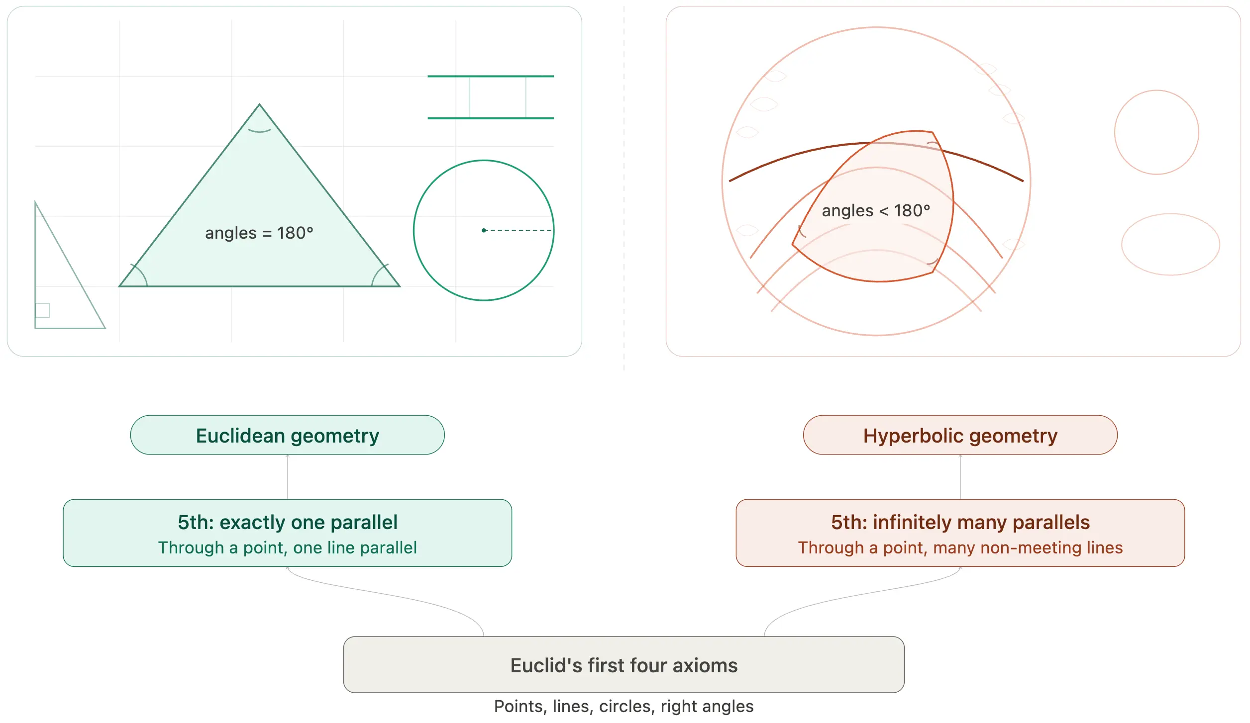 and also the thing of “change one of the Euclidean axioms and you get a totally different (but still totally valid) type of maths” (and this is the case for any axiomatic system, I guess??)