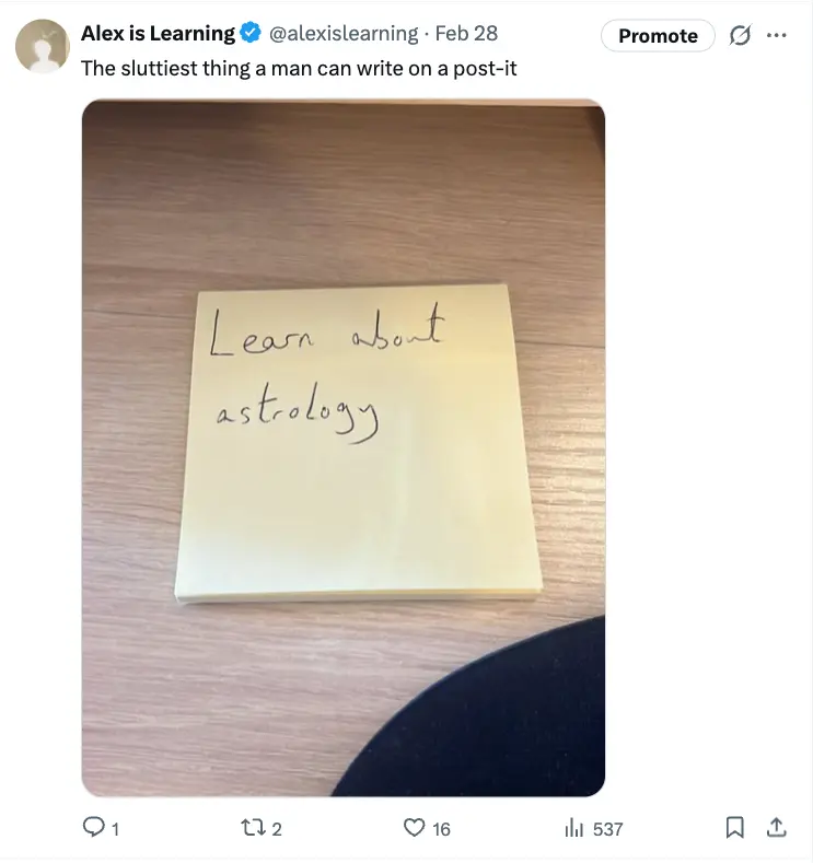 For example, “I like my friend James because he’s warm and funny and charismatic and caring” is great and all, but there’s not much more there. I had the thought that astrology might be a more specialised vocabulary for this stuff.