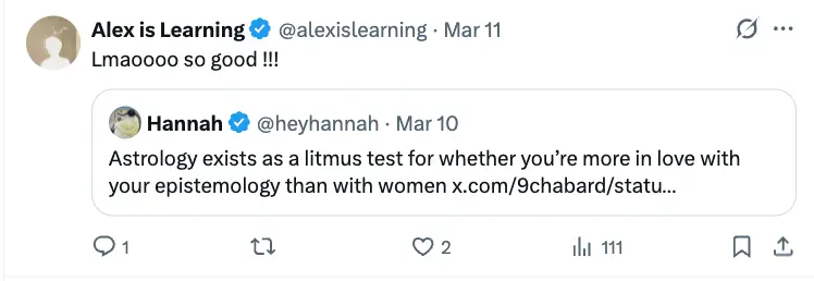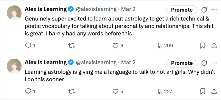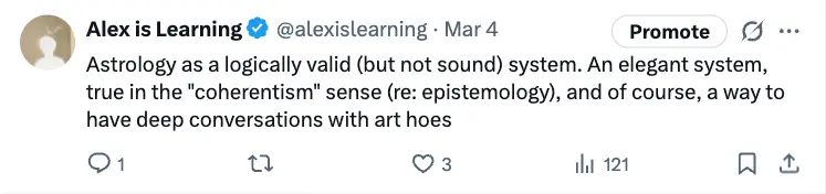 TLDR is that I see astrology as a rich vocabulary for talking about the self and relationships, basically. Internally consistent, known by lots of people, useful for pointing a light on the territory of your self. Also insightful!