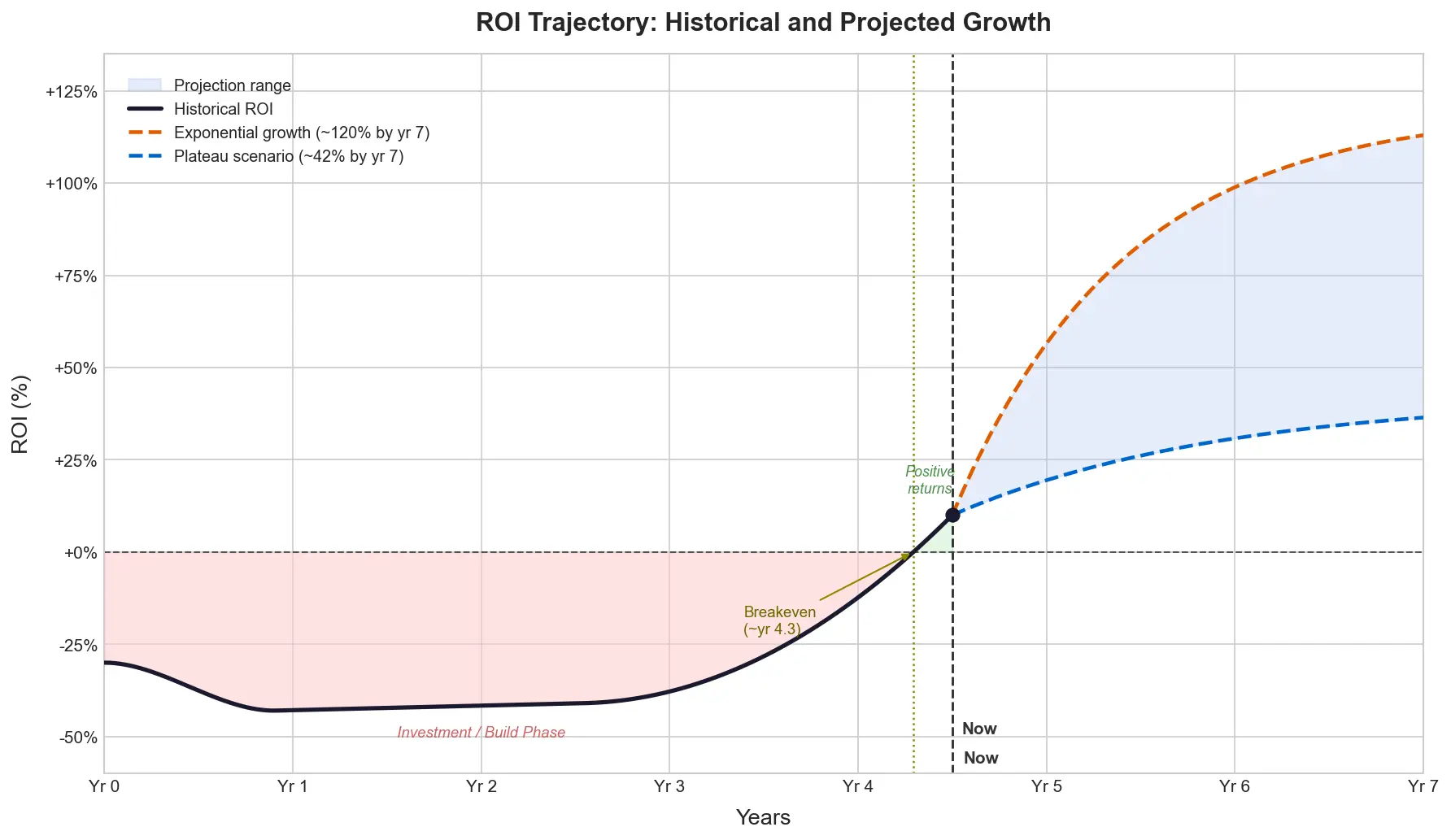 - E.g., re: going in the wrong direction: I had Claude make this visual for me yesterday, re: my learning about “knowledge management software” when I was ~21, how for a long time it was almost certainly actually negative ROI, me naively believing youtubers who said that you need a knowledge management solution like Obsidian, how masses of uneducated people take these people at face value (lacking the cognitive machinery to assess if the solution of “knowledge management tool” solves an actual genuine bottleneck in their life). But now, at 29, it has finally become a positive ROI. It empowered me to write an enormous amount on this site. I could imagine being someone who is “scared of Obsidian”, rather than totally empowered to use it.