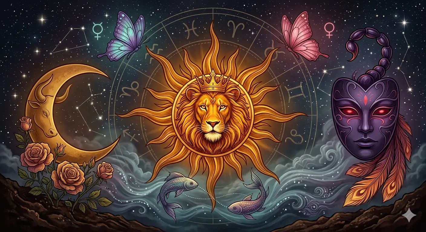 The Taurus Moon (left crescent) — A warm, earthy crescent in deep gold with bull’s horns subtly etched into its surface. Roses bloom from the dark soil below it. Taurus Moon anchors all that Leo fire in the body: sensory pleasure, loyalty, a fierce need for peace and beauty.