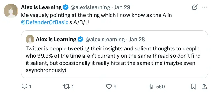E.g., on the 28th of Jan 2026 I tweeted something, and then the next day, I learned about A/B/U and realised that “A” is what I was trying to point at!