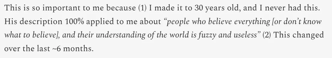 Now that I have this term (which I invented, shout out to me), I can foreground the fact that… I can go months without learning anything significant and new, that updates my world model.